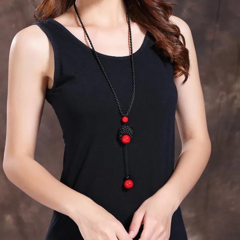 New BYSPT Man-made Knotted Red Stone Beads Stone Long Tassel Retro Ethnic Beaded Necklace Sweater Chain