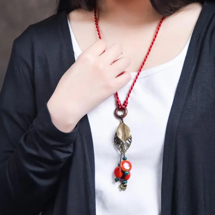 Promo BYSPT Man-made Knotted Red Stone Beads Stone Long Tassel Retro Ethnic Beaded Necklace Sweater Chain
